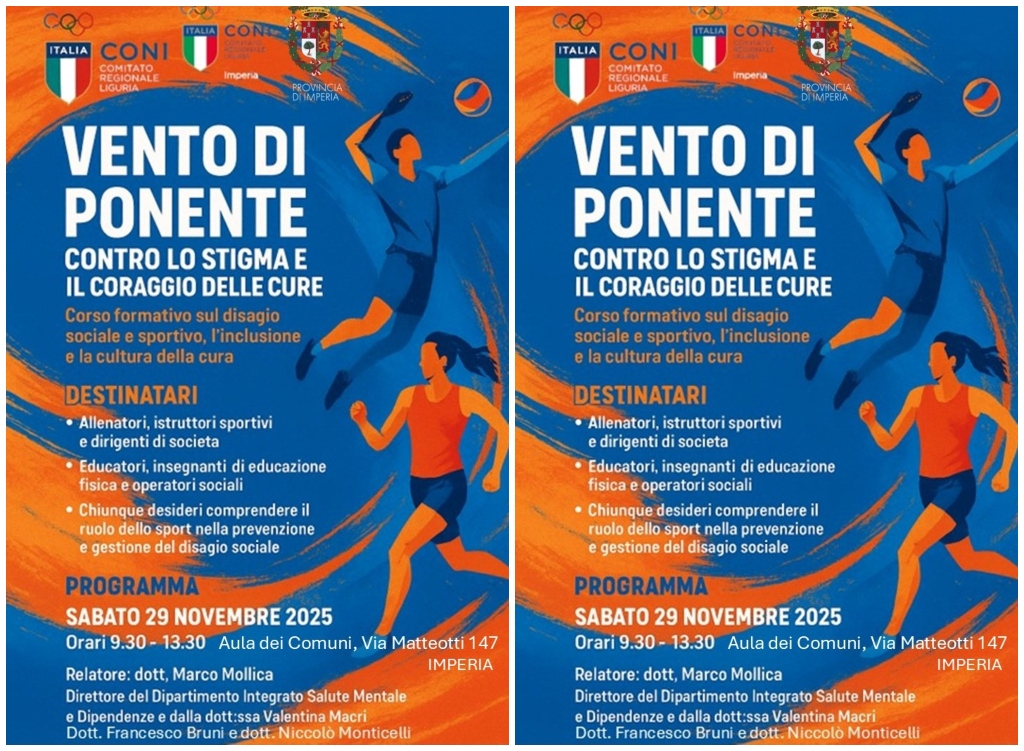 Nella mattinata di sabato 29 novembre 2025, alle ore 09,30, presso la Sala dei Comuni di Imperia in viale Matteotti 147, lo staff Tecnico del Coni organizza l’ evento Formativo “VENTO DI PONENTE- contro lo stigma e il coraggio delle cure” .