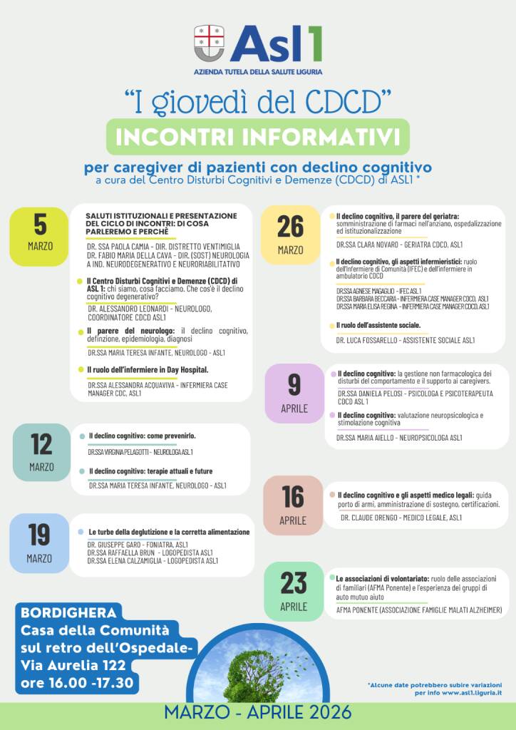 Gli appuntamenti si svolgeranno dalle 16 alle 17,30 presso la Casa della Comunità di Bordighera (retro ospedale Saint Charles – via Aurelia 122) e sono pensati per offrire informazioni pratiche, chiarimenti e strumenti utili ai caregiver, grazie al contributo di medici specialisti, psicologi, logopedisti e professionisti impegnati nel settore.