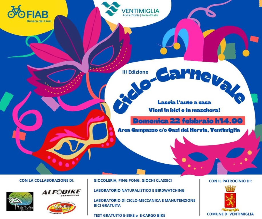 Giochi, laboratori, musica e divertimento. Domenica 22 febbraio alle 14 nell’area Campasso e Oasi del Nervia a Ventimiglia andrà in scena la terza edizione di “Ciclo-Carnevale!”.